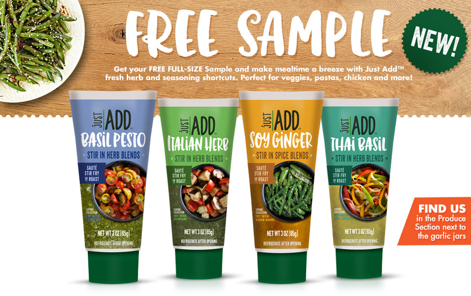 Submit for your chance to receive your free Just Add Herb Blends – Basil Pesto, Italian Herb, Soy Ginger and Thai Basil. Those selected will be notified they’ve been chosen to receive a coupon good for a free full-size product.